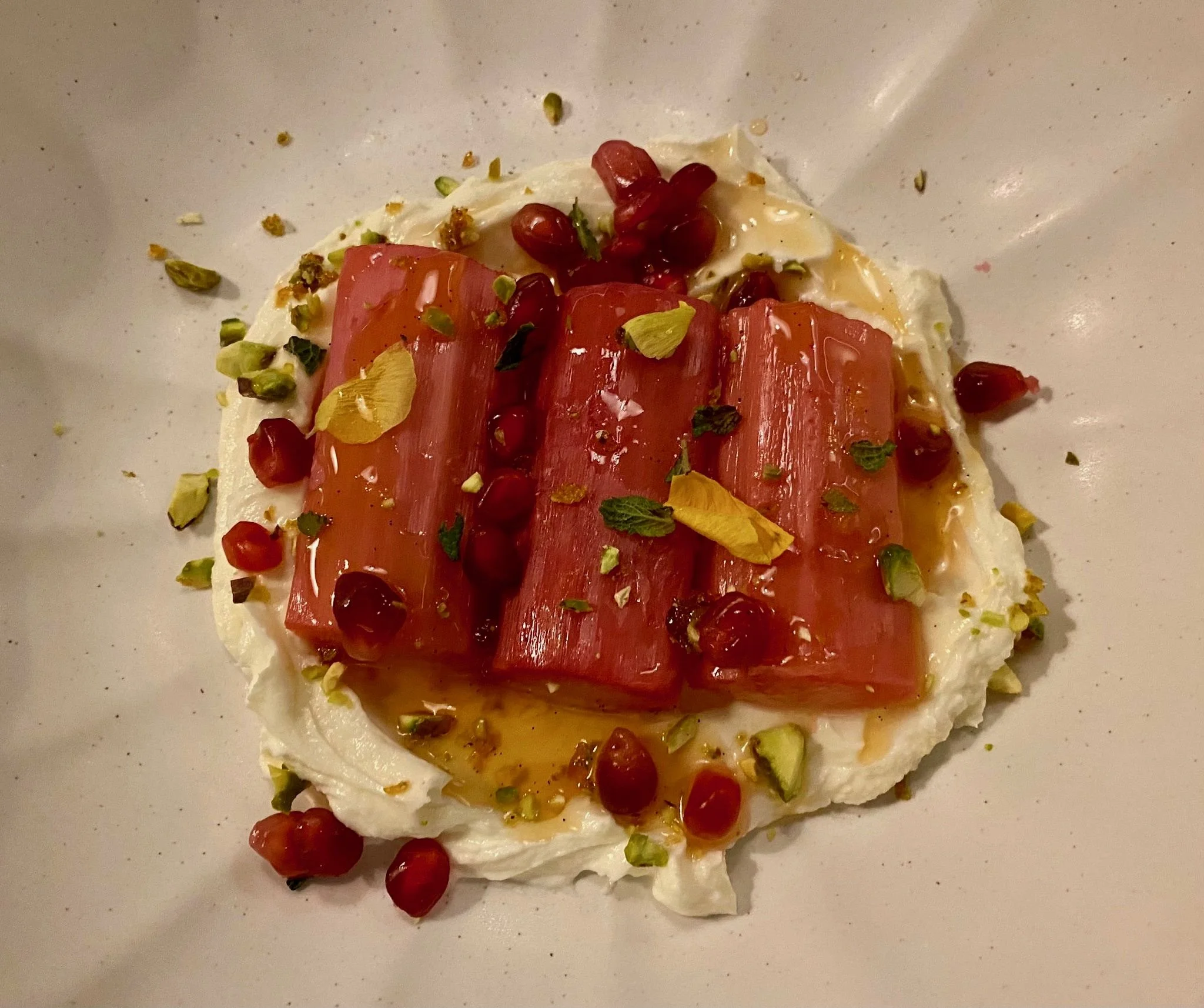 Forced rhubarb, zesty Labneh, toasted almonds and gingerbread crumb